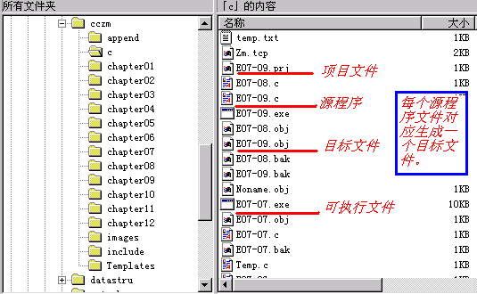 这里要注意的是编译的过程中每一个源程序文件都要对应的生成一个目标文件,它的扩展名为obj。函数代码放在目标文件中,可以被其它的语言所调用,同样,C程序也可调用其它语言生成的目标文件中的函数。目标文件中存放数据、变量、和函数代码,只是它们在内存中的存储位置不确定。联接程序作的工作就是安排所有目标文件中的数据与函数代码,把存储位置确定下来,便于函数间的相互调用。